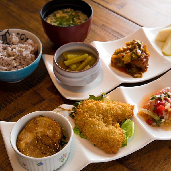 おなかが空いている時におすすめのおばんざい定食。6品のお惣菜を楽しめ、栄養満点でやさしい味わい。ビールやワイン、焼酎、サワーも各種揃っています。